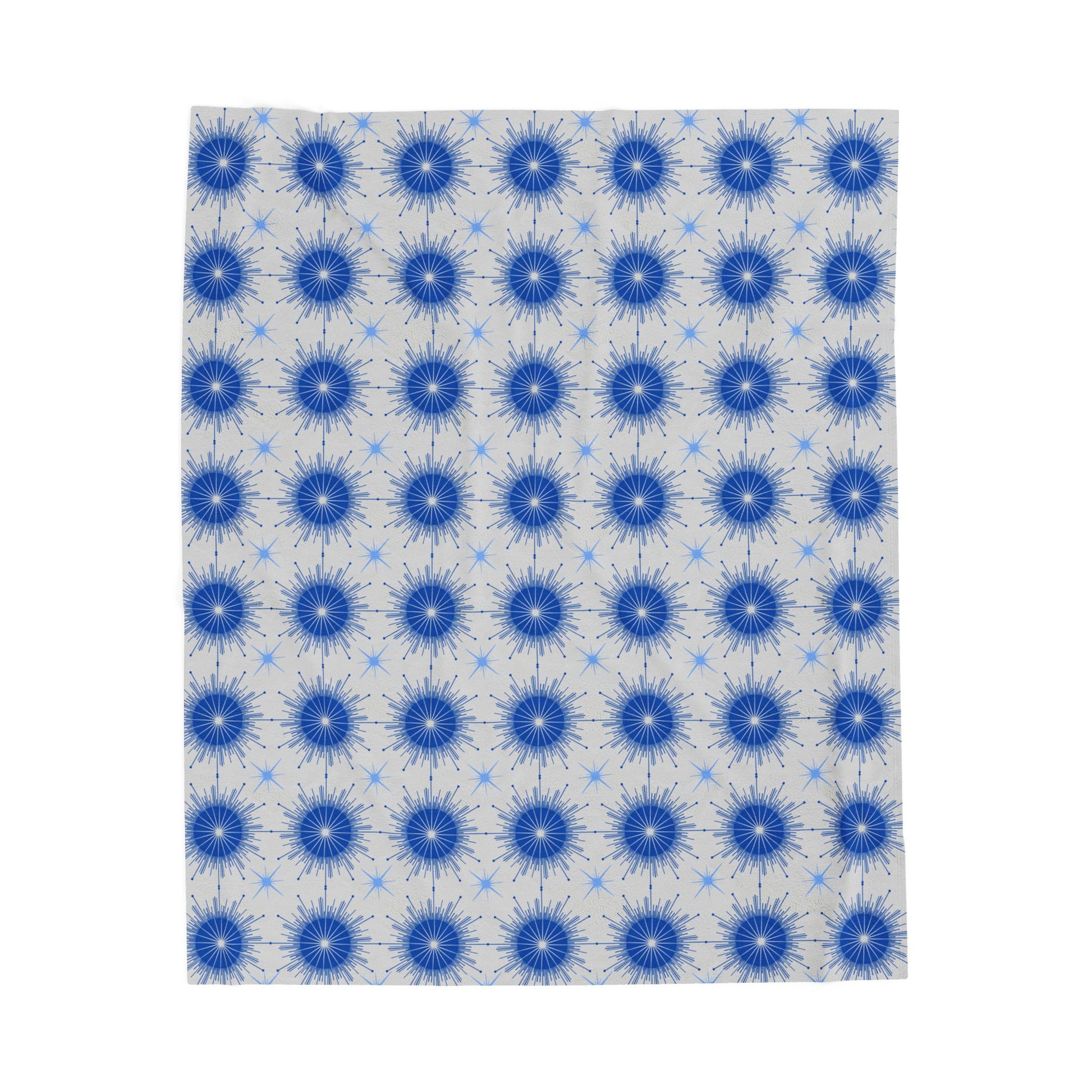 A velveteen plush blanket woven from silky-soft polyester, printed with a calming pattern of radiant blue starbursts against a pale background. It feels warm without weight, draping easily over laps or shoulders. The surface is smooth to the touch and showcases vivid print detail on one side, while the reverse stays a clean, neutral white. Durable double-needle topstitching keeps the edges neat through regular use and washing. This blanket settles into quiet evenings: a cozy layer on the couch during late-night reading, a color pop folded at the foot of a bed, or a comforting wrap after a chilly walk. The design has a gentle, modern-retro rhythm that pairs with minimalist decor or a curated, eclectic living room.