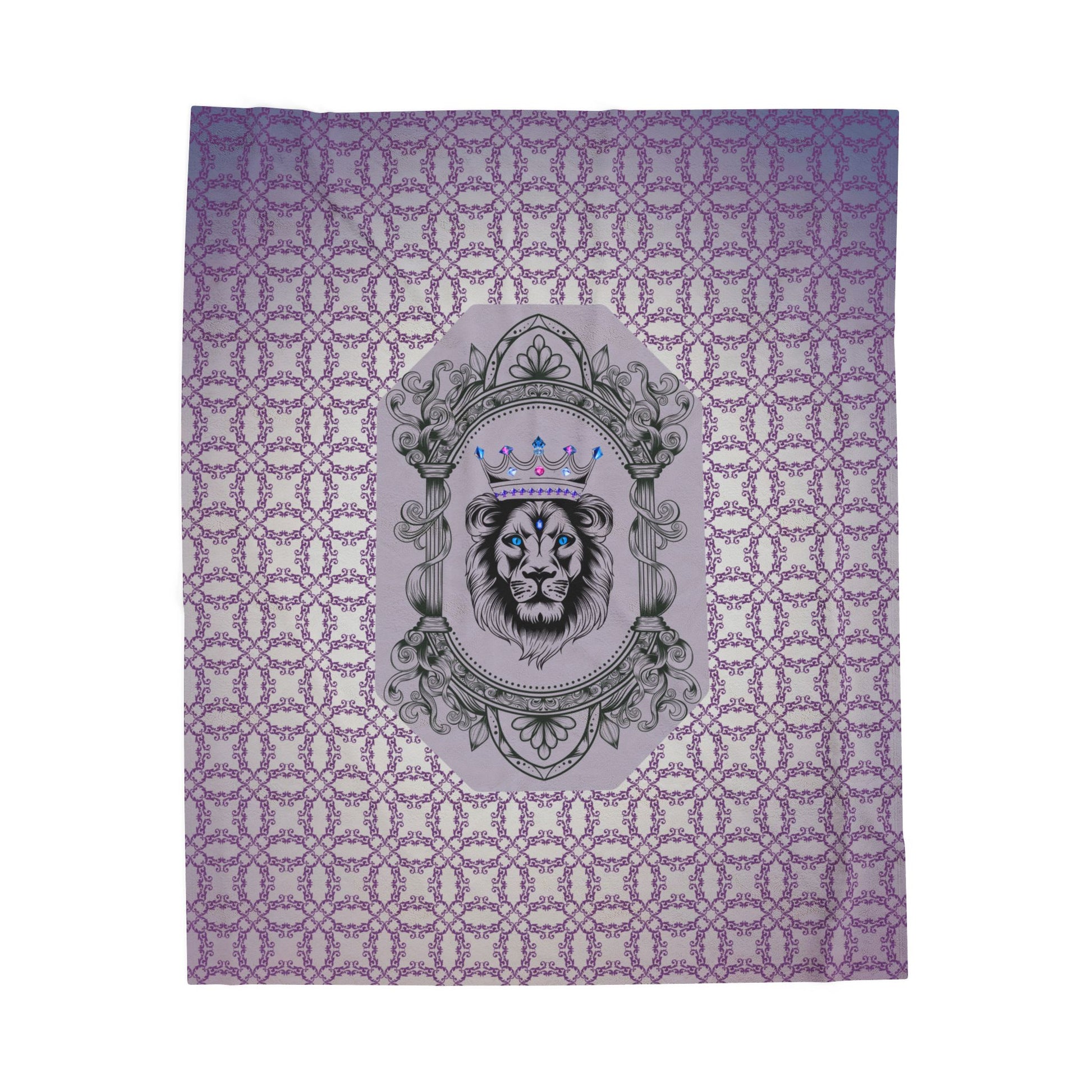 Sink into comfort with a plush velveteen blanket that feels like a quiet, luxurious hush. The soft, medium-weight fabric wraps you in warmth without weight, and the printed lion medallion framed by ornate scrollwork gives the blanket a quietly regal presence. Pale lavender latticework fades toward the edges, creating a gentle, calming backdrop for the central crest. Use it on the couch during slow Sunday mornings, draped over a reading chair for late-night chapters, or folded at the end of a bed to add a subtle layer of personality. The durable topstitching and vivid single-sided print mean it stays beautiful through regular use while keeping its soft hand against skin.