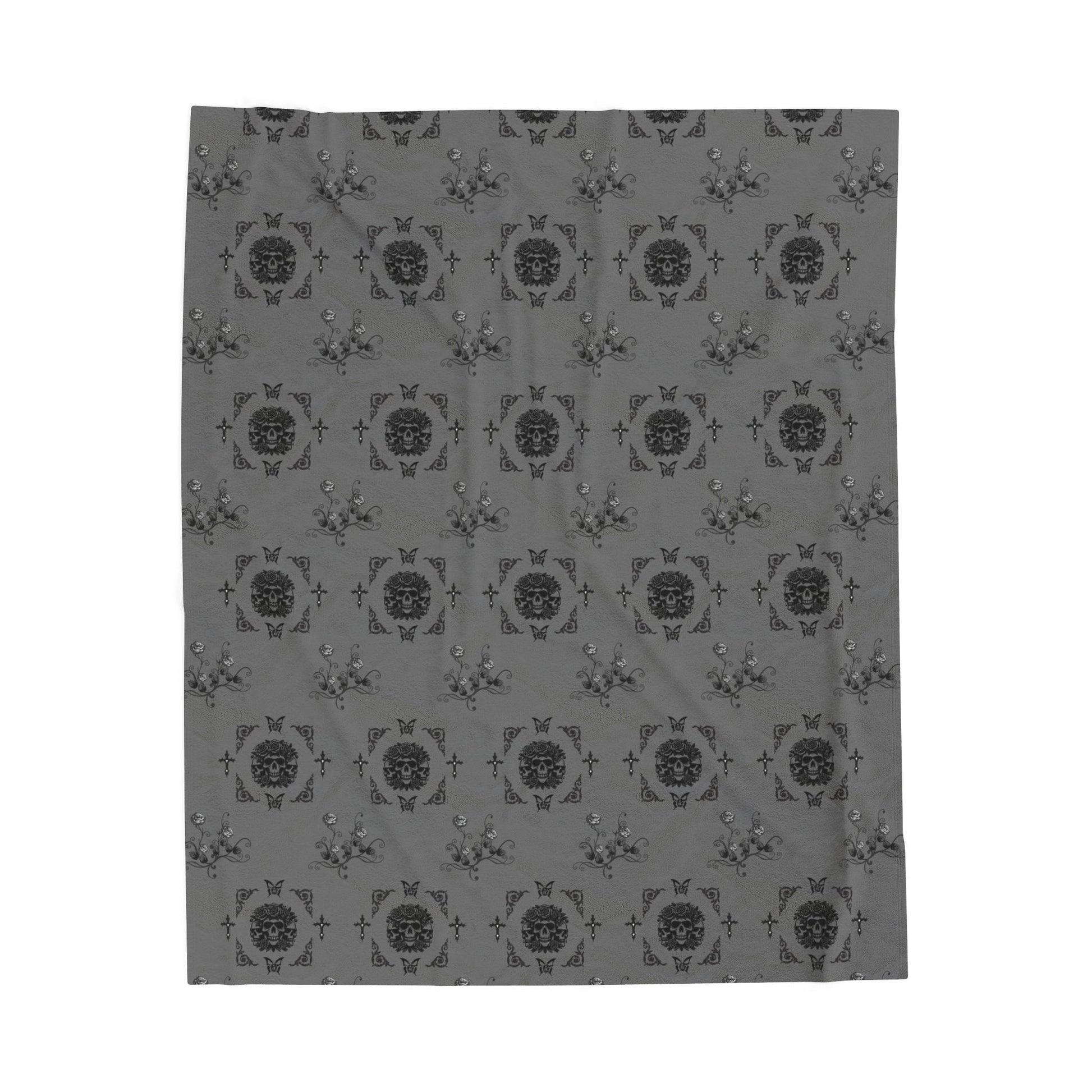 Skulls and Roses Velveteen Plush Blanket — Cozy Grey Floral Crest Throw by EraofInk